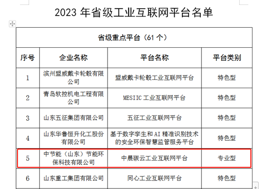 克日,,,,,,,山东省工业和信息化厅宣布《2023年省级工业互联网平台名单》,,,,,,,中节能实业下属山东公司“中晨碳云工业互联网平台”经由现场核查、专家评审等层层选拔,,,,,,,入选省级重点平台。。。。