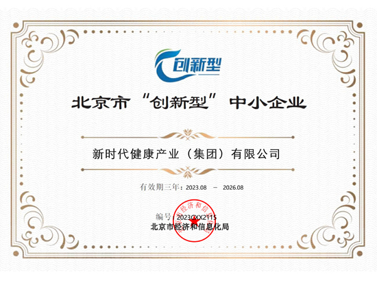 克日,,,,,,新时代康健工业(集团)有限公司依附突出的科研融合生长的立异能力,,,,,,乐成通过北京市经济和信息化局北京市立异型中小企业认定,,,,,,荣获认定证书。。。。。