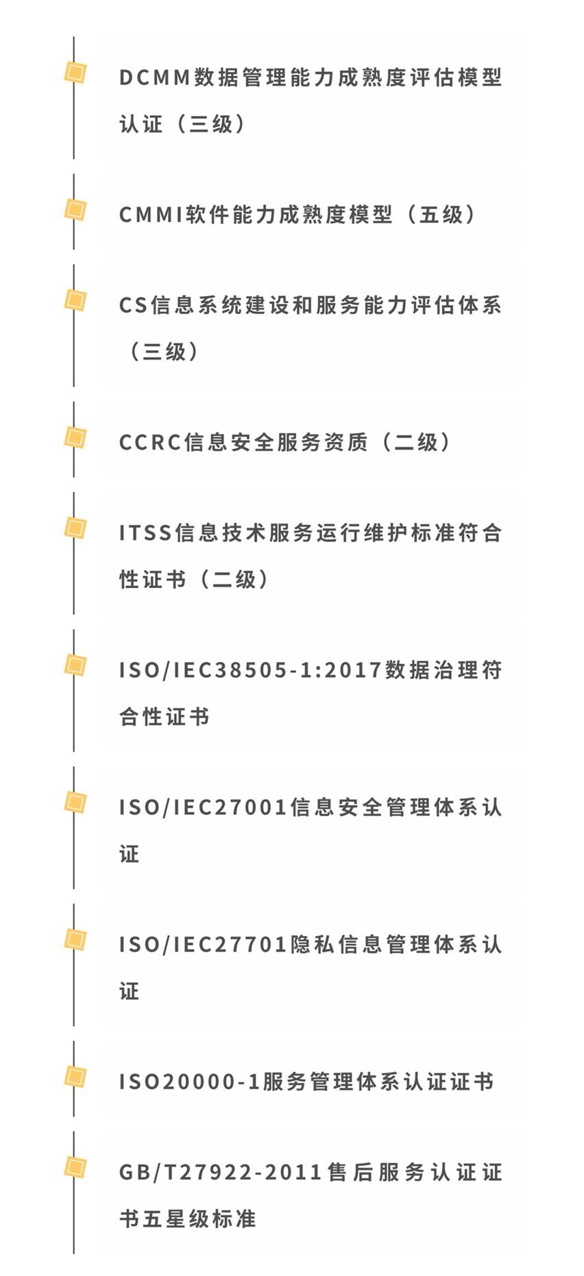 系列资质证书的乐成取得,,,,,,从差别维度证实公司已具备行业高度认可的信息化系统开发及运维效劳、数据战略/架构/治理/应用/清静/质量等综合能力。。。。。。